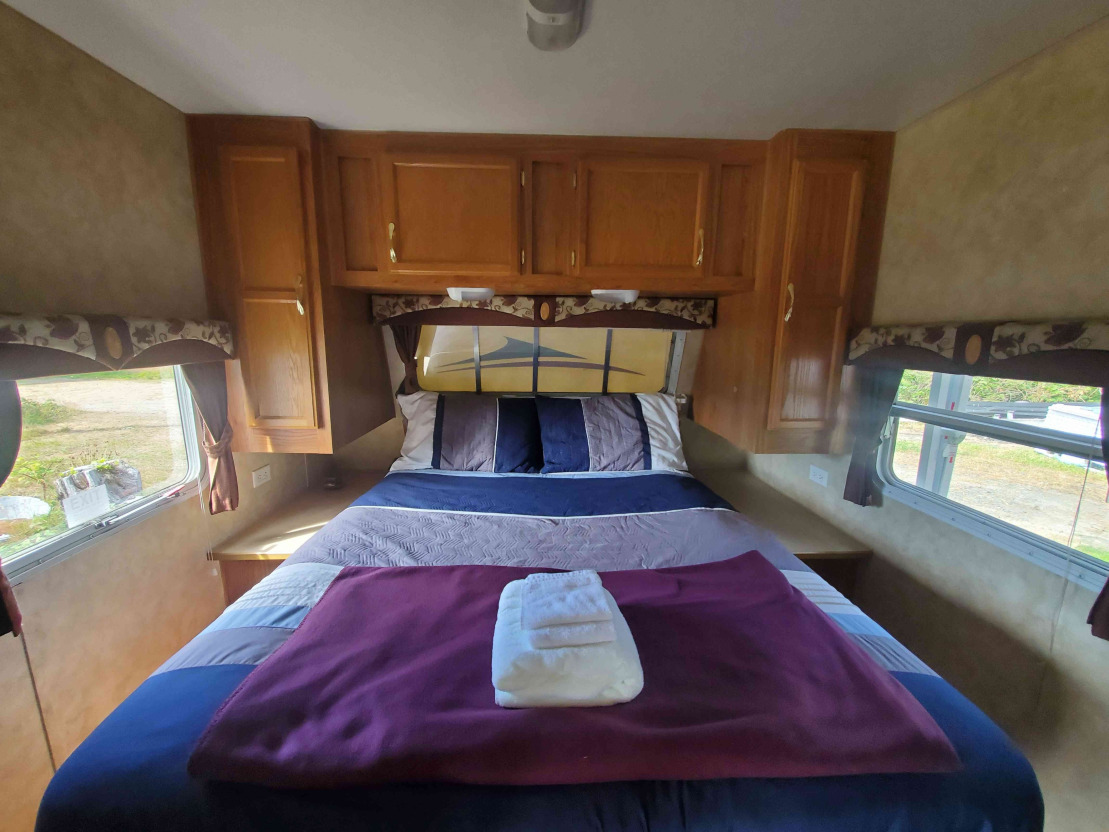 Our 31 ft. Holiday Trailer Expands to 12′ for dining and kitchen area. Our Holiday Trailer is for rent at Winter Harbour Fishing Getaway.