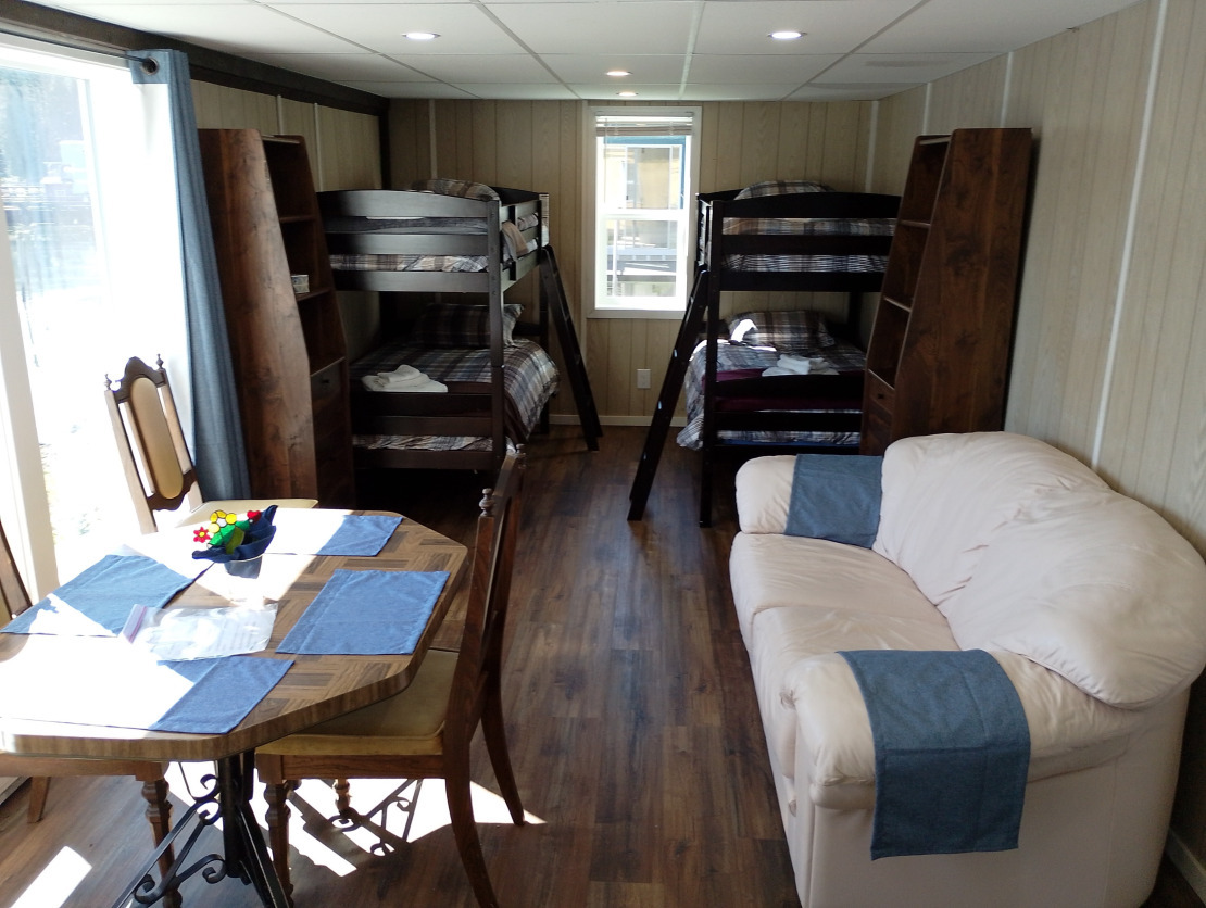 Comes with 4 bunks, bedding, towels, kitchen, coffee maker, microwave, dishes, dining table, Fridge, stove, 3 piece (shower) bathroom and a small couch in the living area.