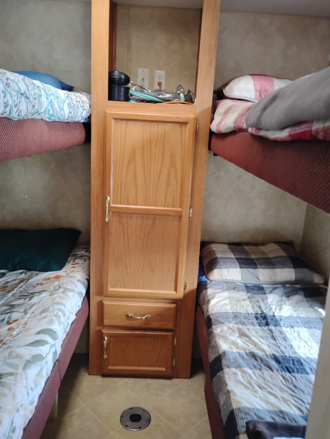 Sleeping arrangements for 6 people with a queen bed, and 4 bunks.