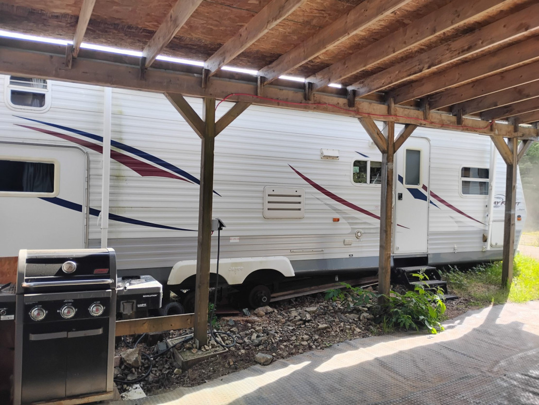 Our 31 ft. Holiday Trailer Expands to 12′ for dining and kitchen area. Our Holiday Trailer is for rent at Winter Harbour Fishing Getaway.